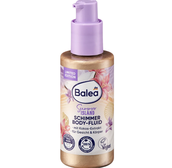 Description : Le Schimmer Body-Fluid Summer Island de Balea apporte à la peau une magnifique luminosité. Ce fluide polyvalent convient pour le visage et le corps, s’applique facilement et rapidement. Enrichi en extrait de noix de coco, il nourrit intensément la peau et laisse un toucher soyeux. Il offre un léger effet scintillant pour un look estival éclatant, parfait pour illuminer la peau et lui donner un aspect frais et glamour.
