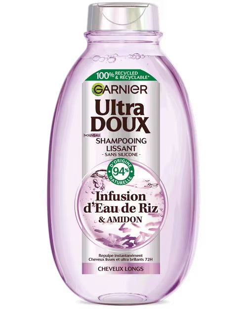 Le Garnier Ultra Doux Shampooing Infusion d’eau de riz & amidon est conçu pour les cheveux normaux à gras et convient particulièrement aux cuirs chevelus sensibles ou sujets aux sensations de tiraillement.